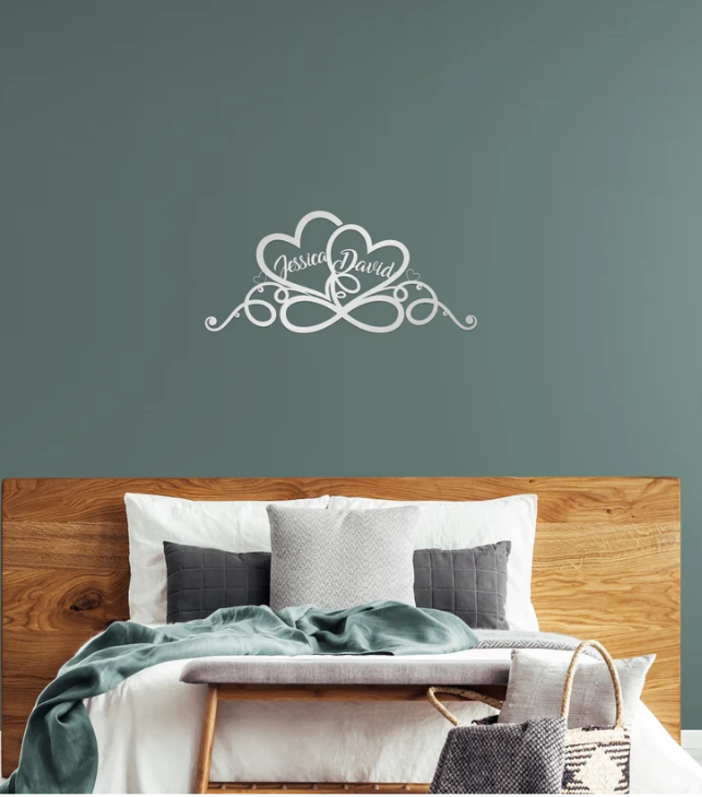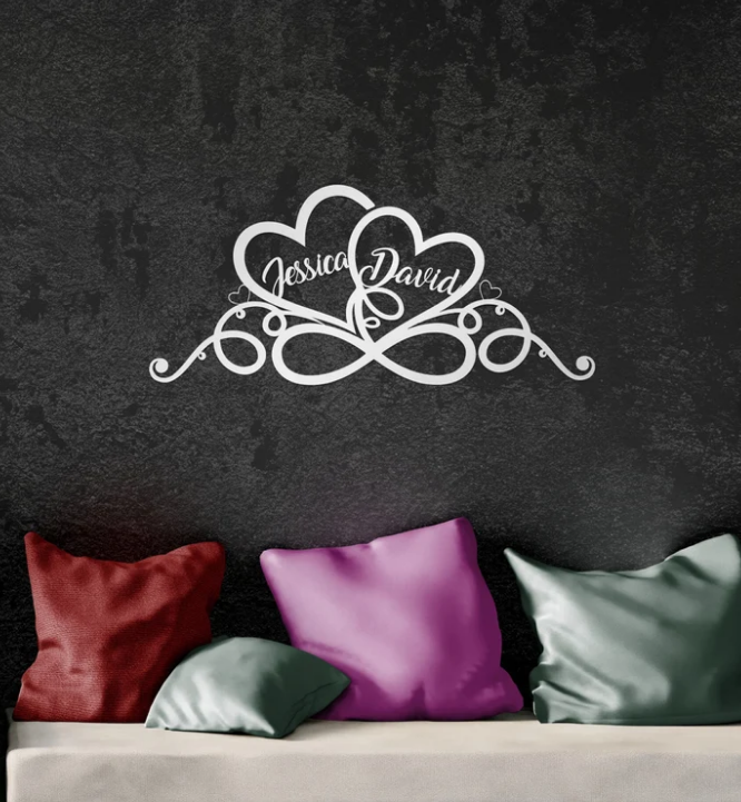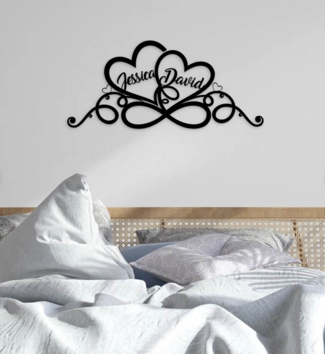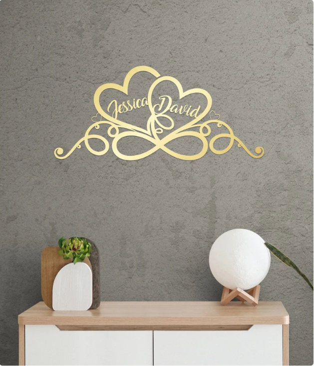 Η μεταλλική κατασκευή "Personalized Wedding for Couple decor" είναι μια μοναδική και ρομαντική διακοσμητική κατασκευή η οποία μπορεί να χρησιμοποιηθεί και ως δώρο σε ένα ζευγάρι που ετοιμάζεται να ενώσει τις ζωές τους. Αυτή η κατασκευή απεικονίζει δύο πανέμορφες καρδιές στις οποίες αναγράφονται τα ονόματα του ζευγαριού, ενώ στο κάτω μέρος υπάρχει το σύμβολο του άπειρου.